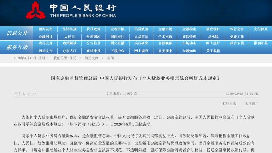 近日,國家金融監管總局、中國人民銀行對外發布《個人貸款業務明示綜合融資成本規定》,要求貸款人向借款人展示綜合融資成本明示表,清晰披露個人貸款息費成本,使個貸各項息費“陽光化”“透明化”。