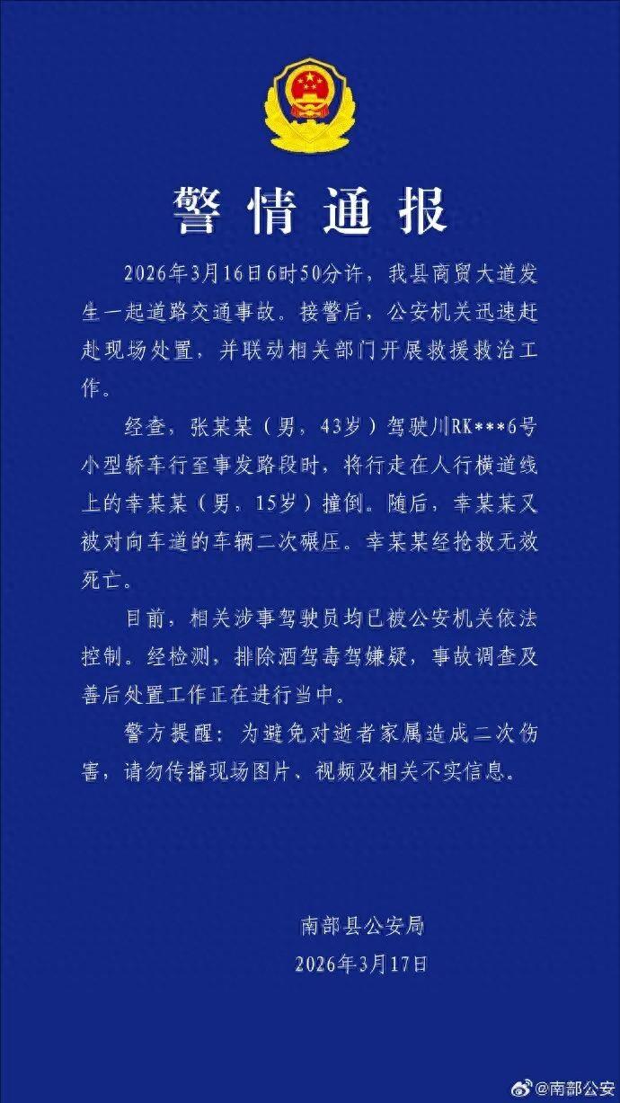 3月16日,四川南充多名網友通過社交平臺發佈視頻稱,當天清晨,當地一名中學生疑遭車禍,此事引發關注。