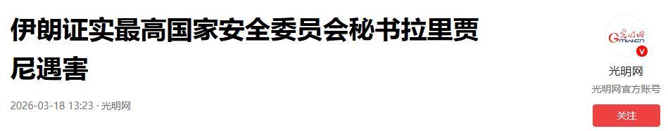 伊朗證實最高國家安全委員會祕書拉里賈尼遇害.2026-03-18 13:23·光明網.