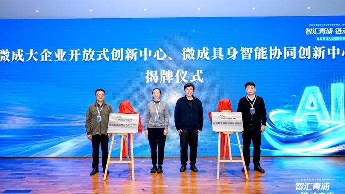 作爲長三角生態綠色一體化發展示範區核心腹地,青浦此次以論壇爲契機,推動AI產業資源加速集聚、協同創新。現場,“微成協同創新中心”正式揭牌,下設的具身智能協同創新中心、大企業開放式創新中心,將聚焦前沿賽道打破企業圍牆,鏈接大企業產業資源與中小企業創新活力,打造長三角AI協同創新標杆平臺。