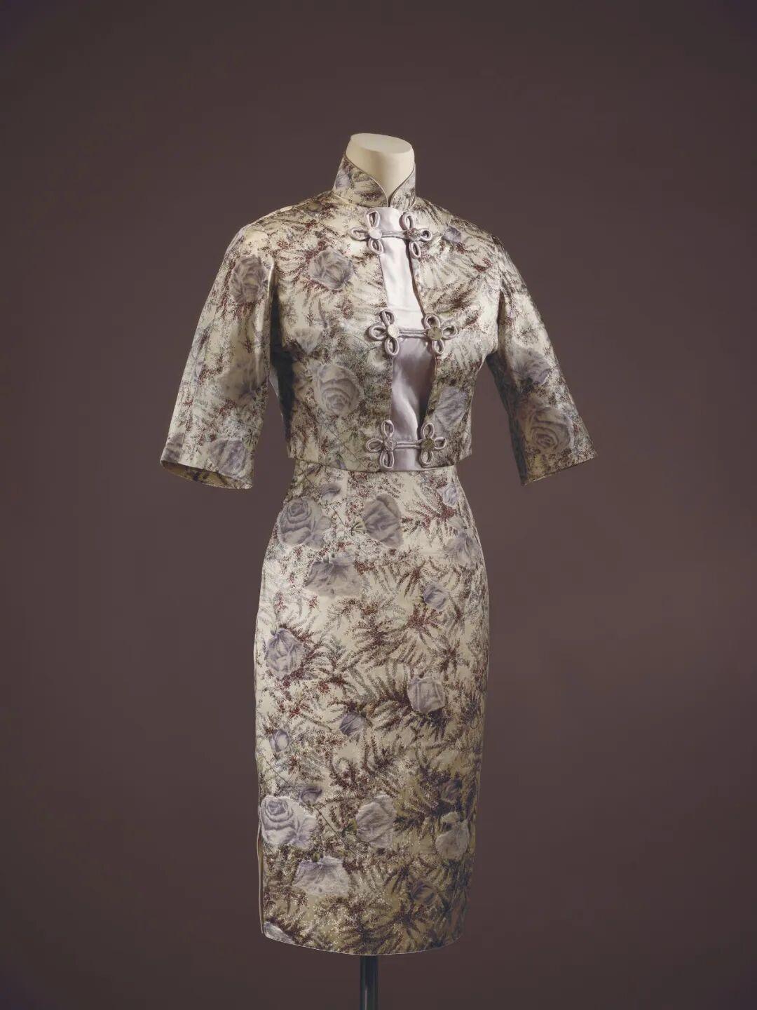 又如上世紀40、50年代開始盛行的新樣式風貌(“New Look”)掀起服飾潮流之際,旗袍高定設計也同樣在風格上進行借鑑,將旗袍和外套作爲套裝設計,外套外觀以新樣式風貌爲借鑑,強調豐胸、細腰、圓肩,搭配寬大或者展示小腿曲線的直筒半腰裙,形成經典的“沙漏”或“花冠”形,與內搭旗袍當時廓形強調女性曲線的設計偏好相一致。上世紀下半葉,國際流行的女性職業裝風格進一步豐富了旗袍的設計風貌。在中西融合的背景下,旗袍套裝整裝風格偏向職業幹練,外套尤以夏奈爾藝術風格爲代表。這一設計導向使旗袍在國際舞臺仍然熠熠生輝,令穿着者於各種社交場合上彰顯自信。