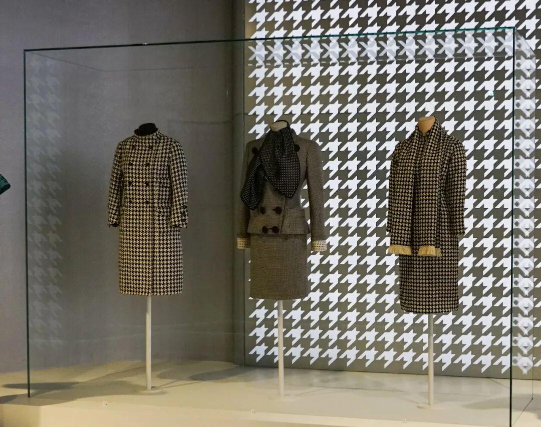 同時,旗袍亦有所堅守,守護立領、斜襟、收腰等標誌性輪廓——這些元素如同文化基因,使旗袍在演變中不失本源。正因爲這種對自身的堅守,旗袍所代表的東方美學不僅沒有消亡,更從被觀看的“異域情調”昇華爲全球設計語言中不可或缺的主體,將主流流行風格自如駕馭。例如“幹練精緻的簡約風”展區中有非常顯眼“千鳥格紋”主題櫃。千鳥格並非一種簡單的圖案,它是一種視覺語言:那精心排列的鋸齒,在秩序中製造輕微的錯動,在嚴謹中透出活力。這款圖案經典魅力在於永遠不會過分張揚,卻總能宣告着穿着者不凡的品位。20世紀40年代開始,千鳥格紋成爲女性職業風的經典面料圖案,香奈兒、迪奧等都將此紋樣作爲面料圖案,在同時代流行的旗袍設計上也與之同步。
