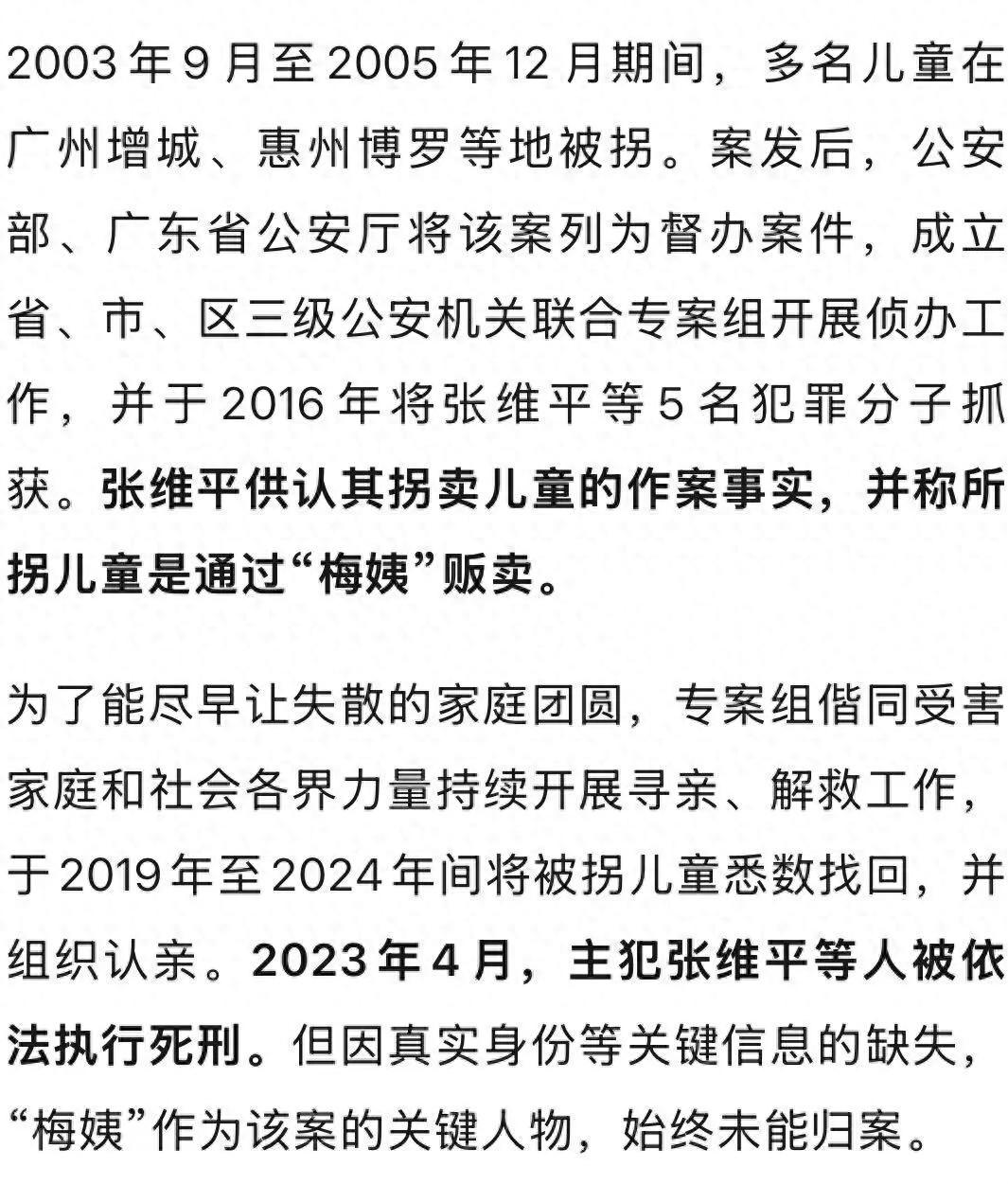 2025年,在公安部指導、外省公安機關的支持下,專案組發現一位名叫謝某某的女子,其特徵與“梅姨”高度吻合。經進一步覈實,謝某某正是“梅姨”。