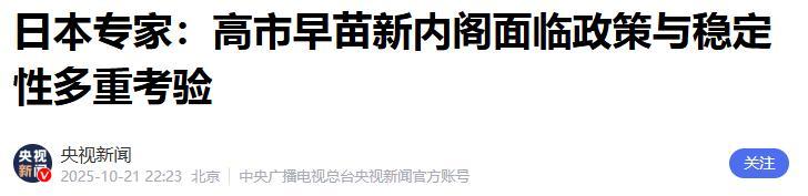 日本專家:高市早苗新內閣面臨政策與穩定性多重考驗.央視新聞.2025-10-21 22:23.