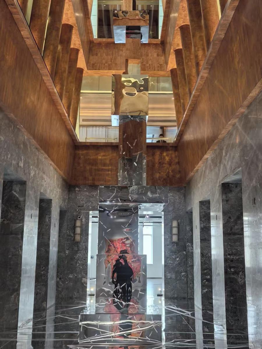 其中最引人矚目的一件作品,是位於展館38米層高中庭的大型裝置。作品用鏡面亞克力進行折射,在空間裏經過鏡面的襯托,在視覺上形成了放大和延展,原本靜態的作品,因與環境產生鏈接,變得靈動起來。藝術家通過這件作品,直觀表達自然和宇宙之間的關係,兼具強烈的科技感和深邃的哲學張力。