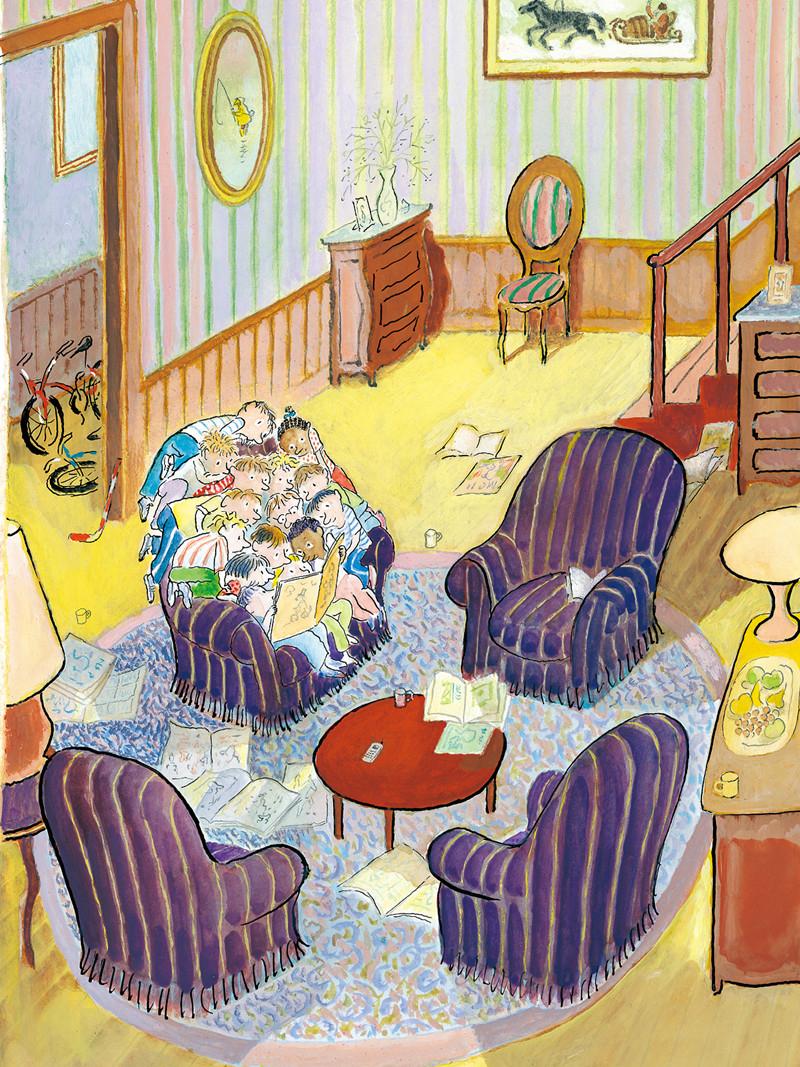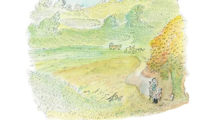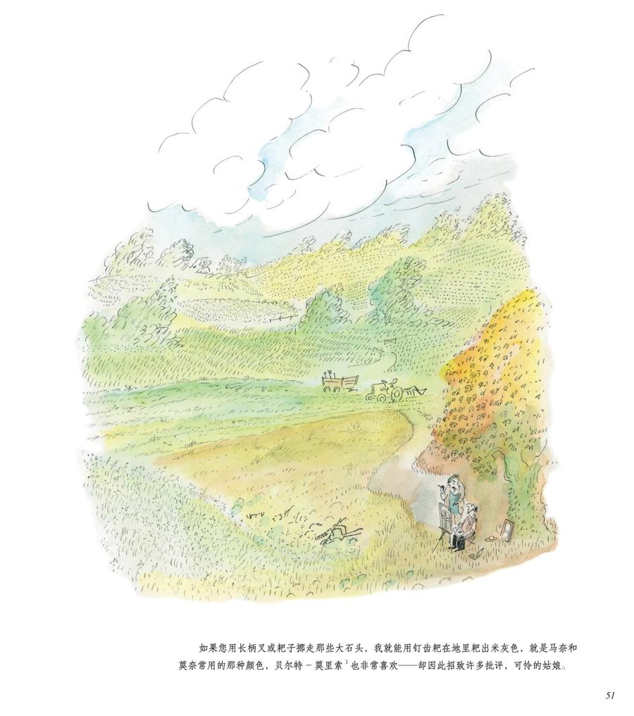 早已站在成功之巔的桑貝始終沒有忘記年輕時遭遇過的挫折,他認定,一個成功者講述在困境中尋找樂趣的故事,一定能給正處於彷徨中的年輕人一點鼓勵、一點勇氣。《穩住,別慌》的第51頁,是全書不多的幾幅彩圖之一。在頗具印象派畫風的畫面上,莊稼綠着樹葉紅了。畫的遠端,是正在田裏忙得歡實的農人,近處,則是兩個寫生的畫家正聊着什麼:“如果您用長柄叉或耙子挪走那些大石頭,我就能用釘齒耙在地裏耙出米灰色,就是馬奈和莫奈常用的灰色,貝爾特—莫里索也非常喜歡——卻因此招致許多批評,可憐的姑娘。”——原來是兩個無名畫家在互相打趣呢。只是,他們對話中提到的一個名字“暴露”了桑貝創作此畫的意圖——貝爾特—莫里索,莫奈的好友、法國印象派畫家。只是這位女畫家時運不佳,但桑貝更想告訴讀者,在畫畫中找到快樂的貝爾特—莫里索,從沒有在意過他人的評價,反倒調出了只屬於她自己的米灰色——她的畫,已被奧賽博物館收藏。