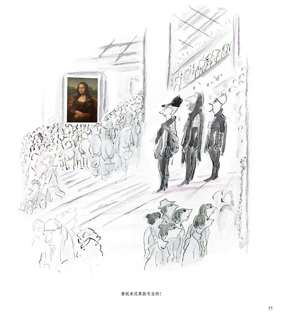 《穩住,別慌》的第55頁是這樣一幅畫:盧浮宮裏《蒙娜麗莎》的真跡前,層層疊疊的人羣在圍觀。兩組近景中的人睜大眼睛緊盯《蒙娜麗莎》的神情,多少有點煞有介事,桑貝爲這幅畫配了這樣一句話:“看起來還真挺專業的!”叫人忍俊不禁。可再仔細端詳,線條裏滿是屬於桑貝的溫情和善意,他是在詼諧地鼓勵讀者到藝術裏尋找快樂。
