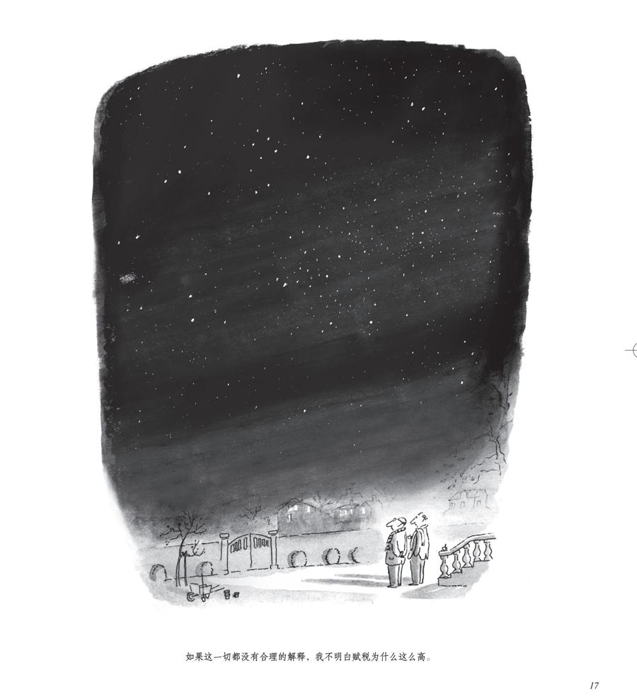 第17頁上的插圖,畫面的五分之四被星星閃爍的夜空佔據,剩下的五分之一里,也許已經酒酣耳熱的兩個髮量稀少的男人正在院子裏對着星空感慨:“如果這一切都沒有合理的解釋,我不明白賦稅爲什麼這麼高。”看幾眼桑貝畫筆下的星空,再來琢磨兩人的感慨,誰都知道“稅賦”只是代名詞,他倆吐槽的,又何嘗不是晚年的插畫大師對過往人生中的坎坷不乏幽默的回望?