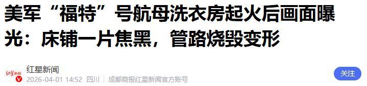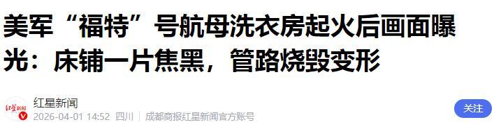 美軍“福特”號航母洗衣房起火後畫面曝光:牀鋪一片焦黑,管路燒燬變形.紅星新聞.2026-04-01.