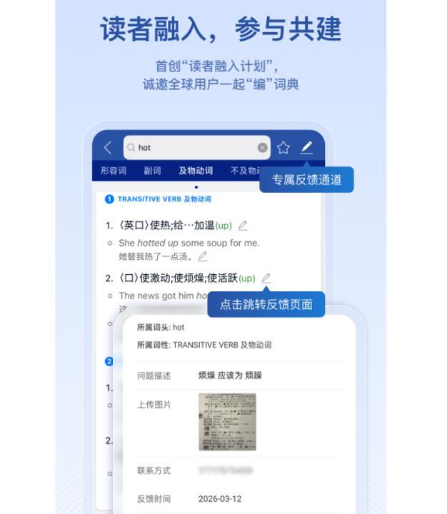 APP上線後,會員均可參與“讀者融入計劃”,在相應功能頁面爲詞典編纂貢獻最新語料。這一在線功能將突破“讀者融入計劃”原先只能依託“讀者羣”進行的侷限,做到每個人隨時隨地能對編纂產生貢獻。編纂處將對讀者貢獻的語彙及例證進行進一步校準和選擇。