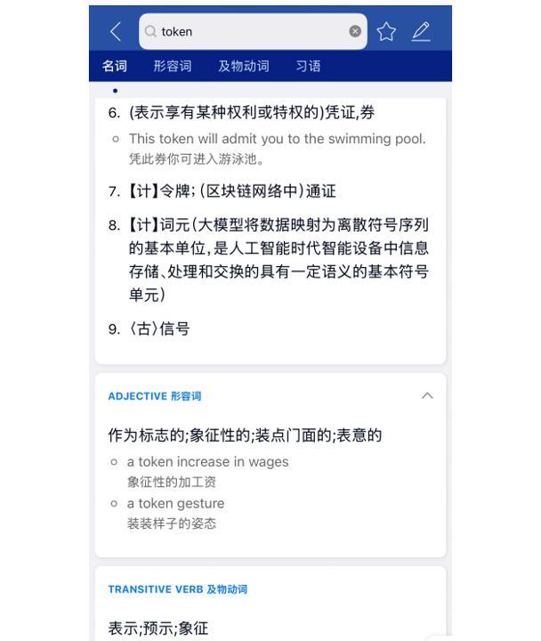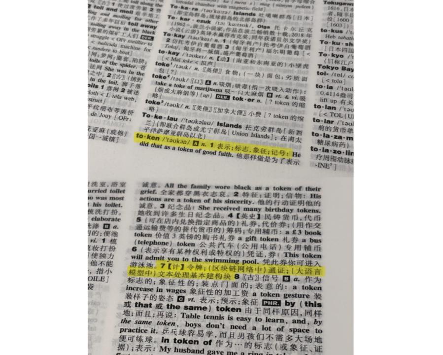 打開新推出的《英漢大詞典》APP,token一詞釋義已更新加入“詞元”這一釋義。該釋義是全國科學技術名詞審定委員會(全國科技名詞委)在近期剛剛確認的規範化中文定名。