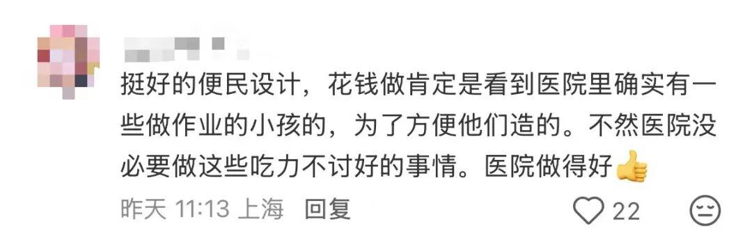 “上次帶孩子來醫院,都是蹲在地上、把作業本放在椅子上做作業的孩子們。今天來,新增了一排書桌椅,很多人說太捲了,生病了還要做作業,但作爲家長來說,真的覺得這個桌椅是剛需,有些病是需要來看的,但確實也不影響做作業的,能排隊時候做掉些作業,晚上也能早點睡覺 。”