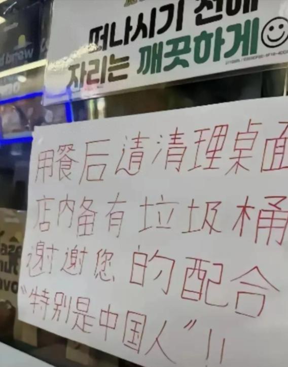 韓國確實有自助清理的習慣,但專門點出"特別是中國人",還只寫中文,擺明了就是帶着偏見。