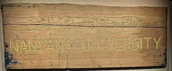 百年前交通大學的英文校名牌,校名牌爲木質,中上部略有裂痕、缺邊,文字爲陰刻,字跡清晰,所塗金粉仍完好如初。