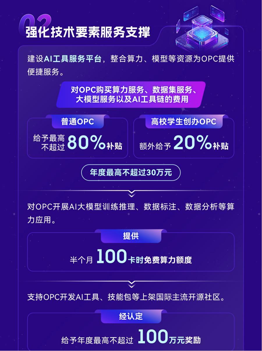 《若干措施》明確,對OPC購買算力服務、數據集服務、大模型服務以及AI工具鏈的費用,給予最高不超過80%的補貼;高校學生創辦的OPC,可額外享受20%補貼,年度補貼最高可達30萬元。所有OPC均可直接申領半個月100卡時的免費算力額度,零成本開啓AI研發工作。更值得關注的是,政策專門設置了技術創新專項獎勵,OPC開發的AI工具、技能包等上架國際主流開源社區,經認定可獲得年度最高不超過100萬元的獎勵,真金白銀鼓勵技術創新與全球化落地,讓OPC創業團隊的創新價值得到充分認可。