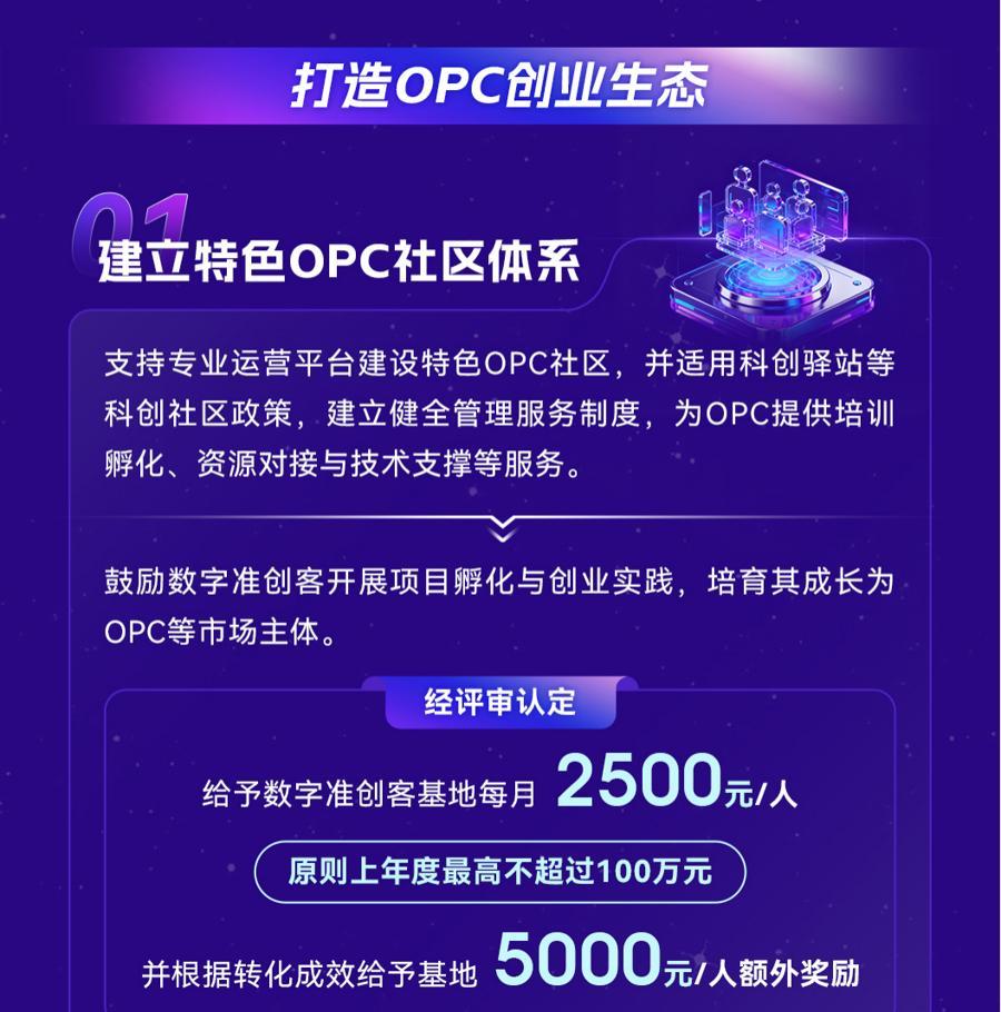 政策支持專業運營平臺建設特色OPC社區,並適用科創驛站等科創社區政策,配套培訓孵化、資源對接與技術支撐服務;對數字準創客孵化基地,給予每月2500元/人的運營補貼,原則上年度最高不超過100萬元,還可根據項目轉化成效享受5000元/人的額外獎勵;對建設AI工具服務、數據服務等功能性平臺的機構,按年度服務成效給予最高不超過100萬元獎勵。
