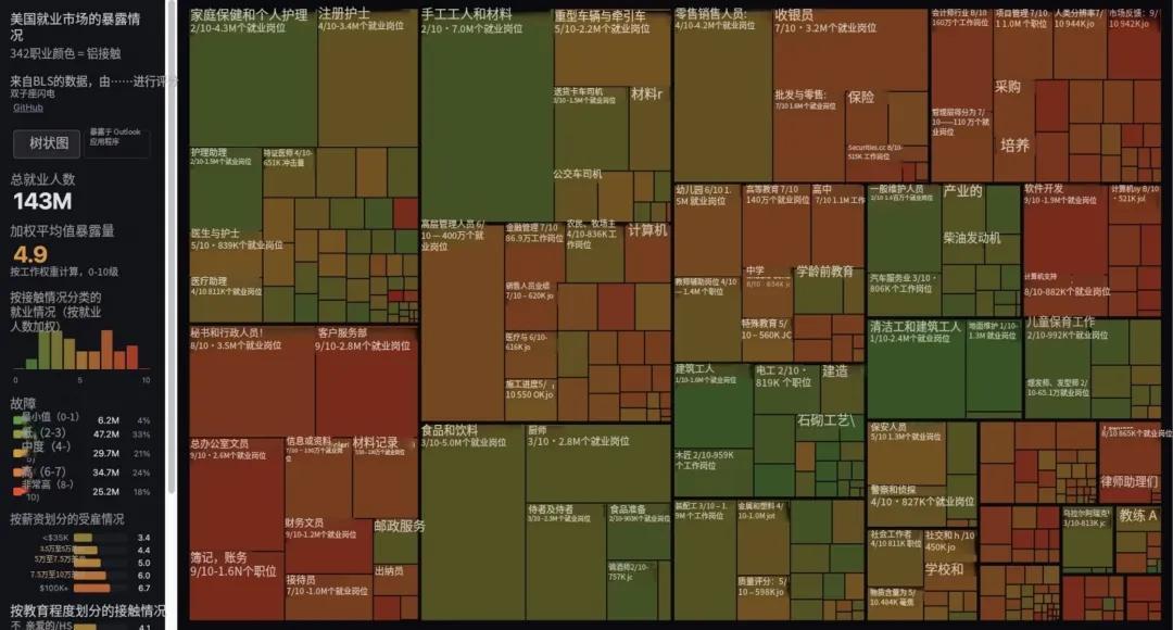 OpenAI 聯合創始人Andrej Karpathy對美國342個職業做了一次AI替代風險暴露度評分,發現有41%的勞工落在高風險區,其中財務、文員、信息服務等是重災區。