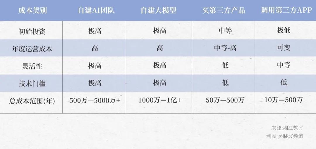 搭建AI基礎設施需要大量資金投入。舉例來說,如果要自建AI團隊,企業需要採購GPU、服務器、傳感終端、數採設備、數據及數據處理服務等,再組建一個人均年薪50—100萬、3—5人的核心工程師團隊,成本輕易上千萬。