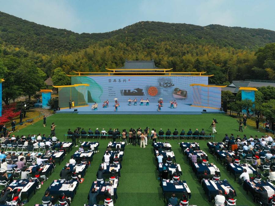 東晉永和九年,大書法家王羲之與好友聚首蘭亭,酒後乘興寫就“天下第一行書”——《蘭亭集序》,此後“曲水流觴”成爲千古佳話,蘭亭也成爲聞名世界的書法聖地。自1985年起,紹興在每年農曆三月初三舉辦蘭亭書法節,邀請四方來賓交流書法藝術最新成果、賡續“蘭亭雅集”文化傳承。42年來,各界以蘭亭爲名、以書法爲媒,共同成就了這場筆墨不斷、雅集常新的藝術盛宴。活動現場,伴隨着潺潺流水聲,中外書法愛好者們在清溪旁席地而坐,斟滿紹興黃酒的酒杯順流而下,停至身前,賓客即興賦詩、潑墨,再現“羣賢畢至,少長鹹集”的曲水流觴雅韻。