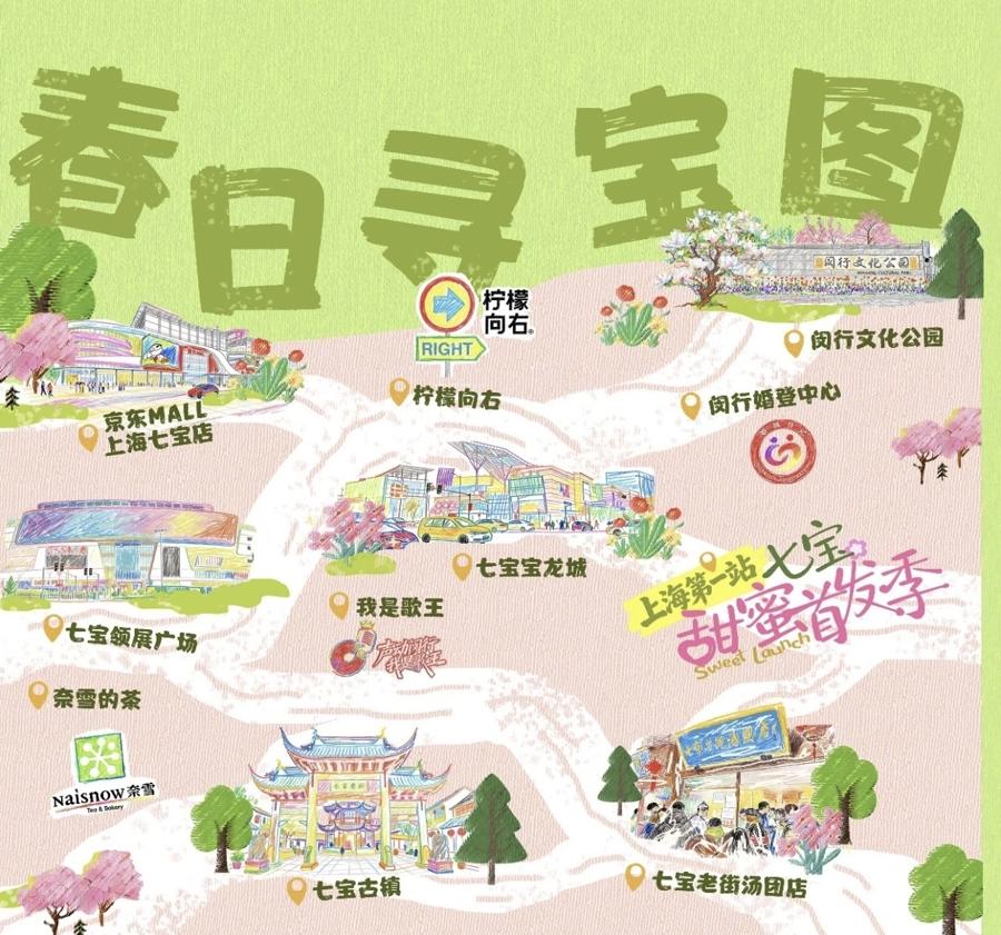 作爲本次活動最核心的互動載體《春日尋寶圖》,自4月25日起,居民與遊客即可在七寶古鎮鐘樓文創店、七寶寶龍城服務檯、七寶領展廣場服務檯、閔行文化公園甜蜜市集內的七寶老街咖啡郵局攤位(市集開放時間爲週末及節假日)四大點位免費領取,一冊在手即可穿梭於千年古鎮與現代商圈之間,體驗“敲願鍾、喫湯糰、拍甜照”的七寶“三件套”,解鎖一場兼具國際範與煙火氣的春日消費盛宴。