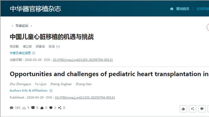 我國兒童心臟移植事業已進入加速發展階段,但供心短缺仍是臨牀救治的核心瓶頸。近日,國家兒童醫學中心、上海交通大學醫學院附屬上海兒童醫學中心張浩、鄭景浩、祝忠羣、傅立軍團隊在《中華器官移植雜誌》發表《中國兒童心臟移植的機遇與挑戰》。文章稱,通過擴大供心選擇範圍、推廣心室輔助裝置、探索異種移植三大關鍵路徑,有望提升兒童終末期心臟病的救治能力,爲更多心衰患兒帶來新生希望。