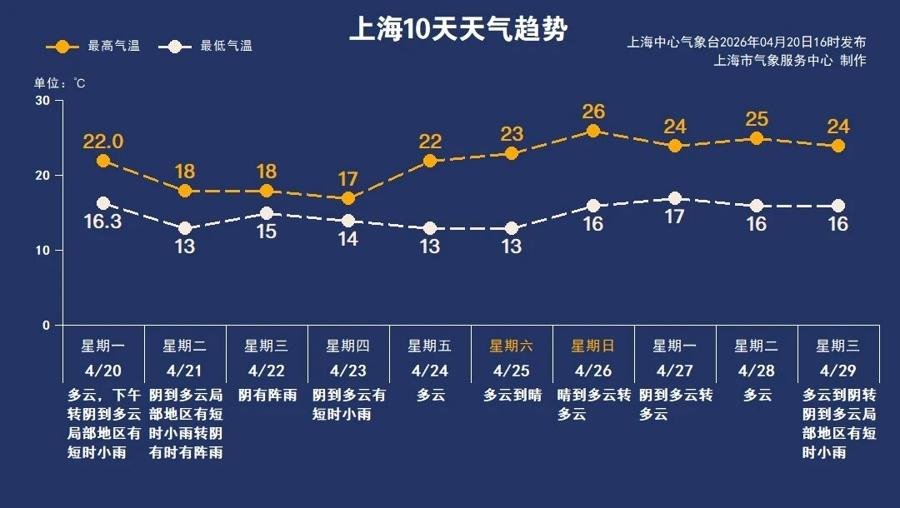根據上海中心氣象臺發佈的數據,本市今天(20日)起進入“穀雨”節氣,陽光也應景地“休假”了——本週工作日,上海多爲陰到多雲天氣,伴有陣雨,其中週三(22日)風雨最爲明顯,提醒市民出行注意。