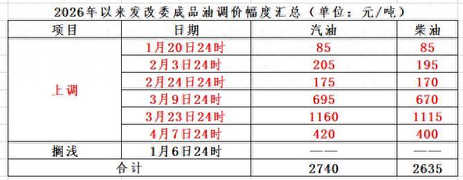 2026年以來,國內成品油零售限價已經歷七輪調整窗口,分別爲“六漲零跌一擱淺”,國內汽油、柴油價格每噸較2025年底分別上漲2740元、2635元。