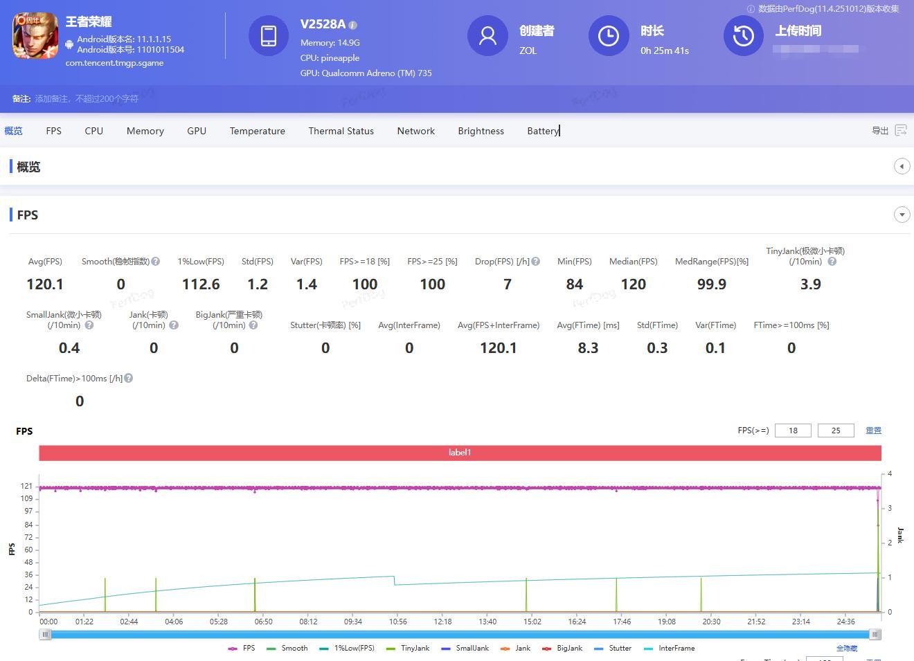 vivo S50搭載了高通第三代驍龍8s旗艦芯片,在《王者榮耀》開啓高畫質的情況下,S50在半小時的遊戲過程中,平均幀率達到120.1幀,整體表現相當穩定。在測試全程中,S50沒有出現明顯的卡頓或發熱降頻現象。