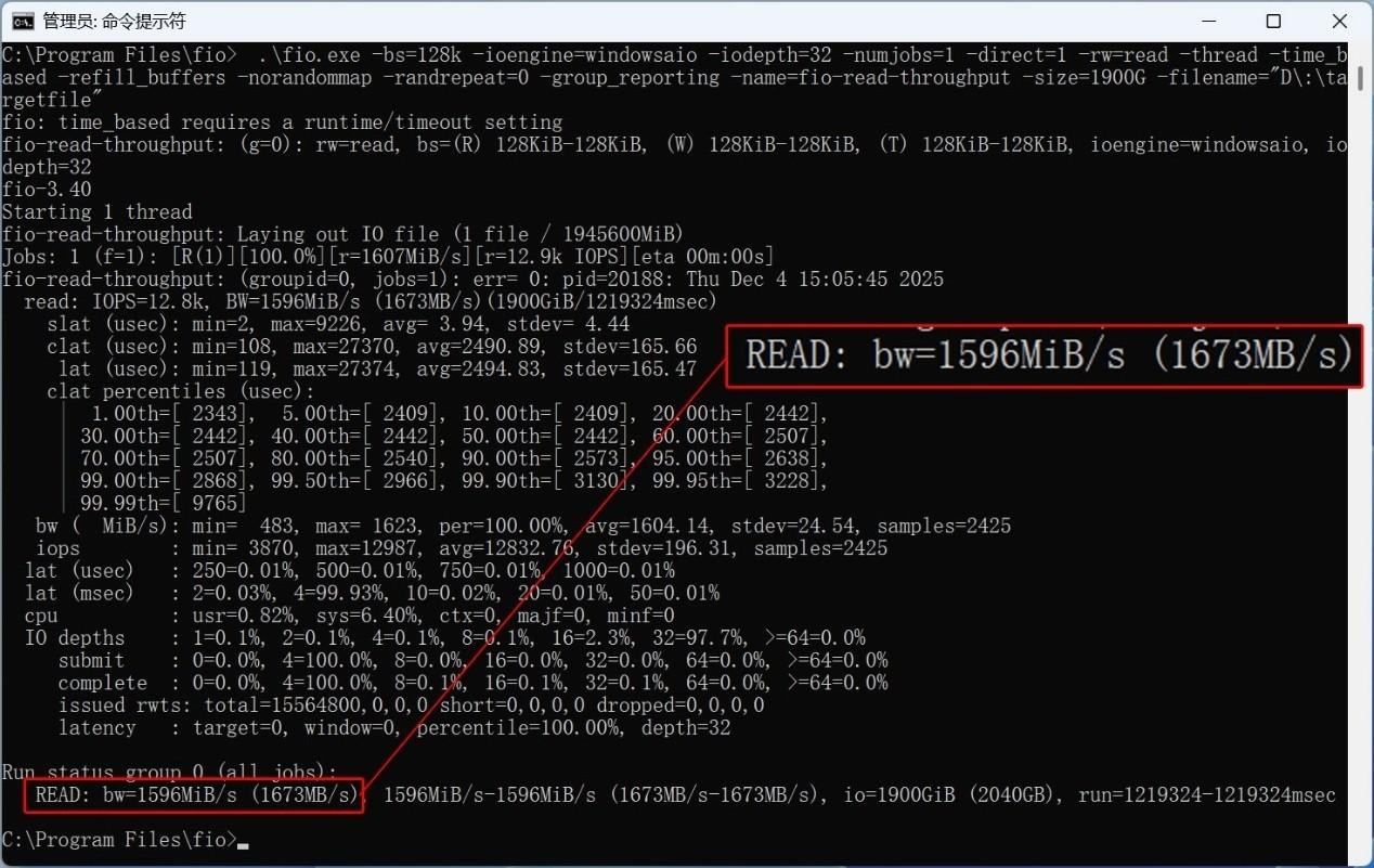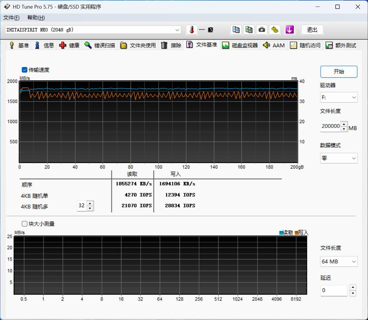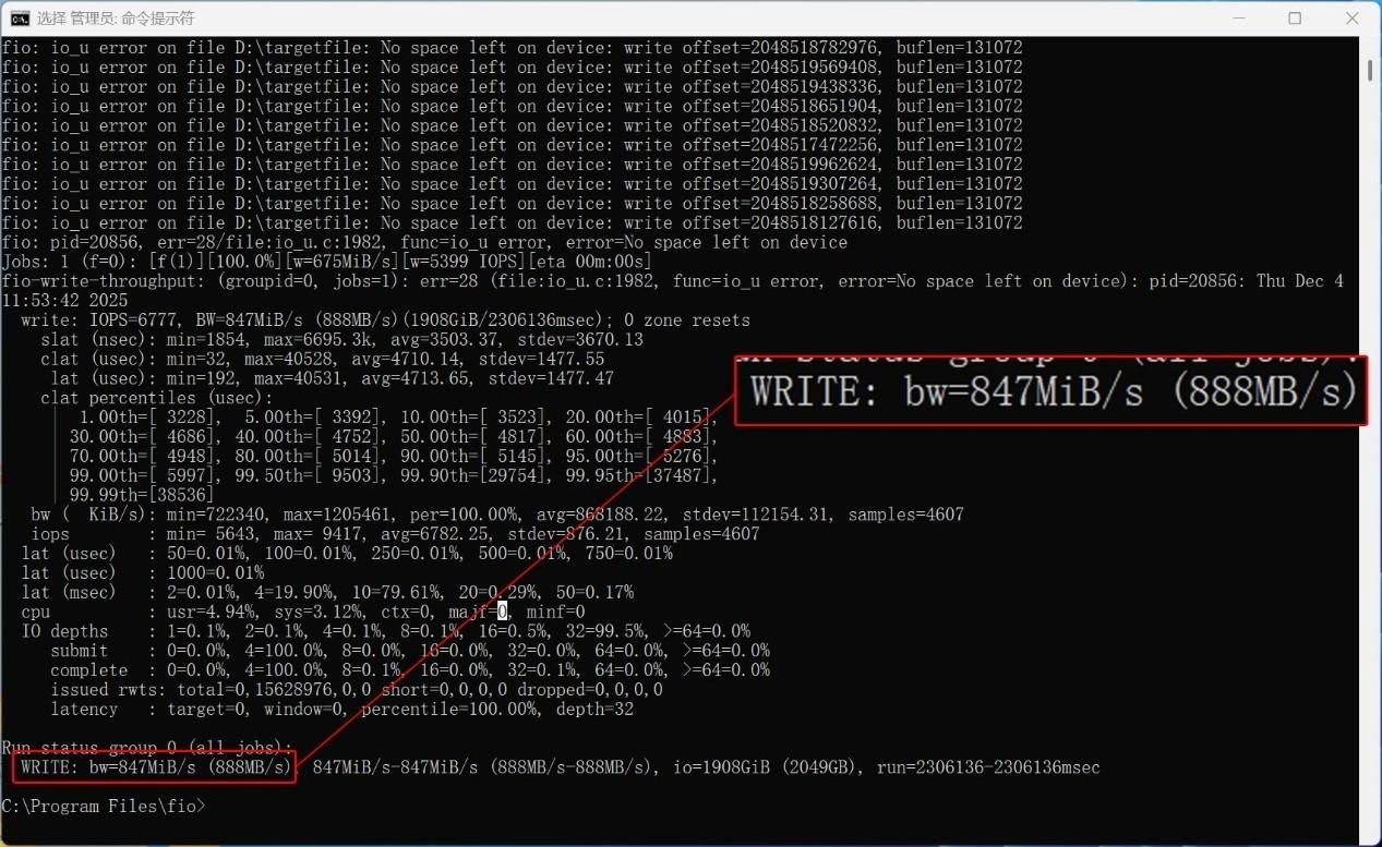 我們進一步探索了致態靈·潮流版移動固態硬盤的極限性能。使用fio進行了全盤讀寫測試,bs=128K,IO深度爲32,其中寫入數據量爲1908GiB(2049GB),讀取數據量爲1900GiB(2040GB)。