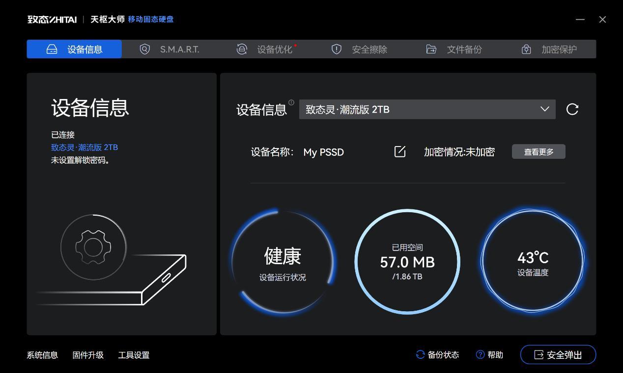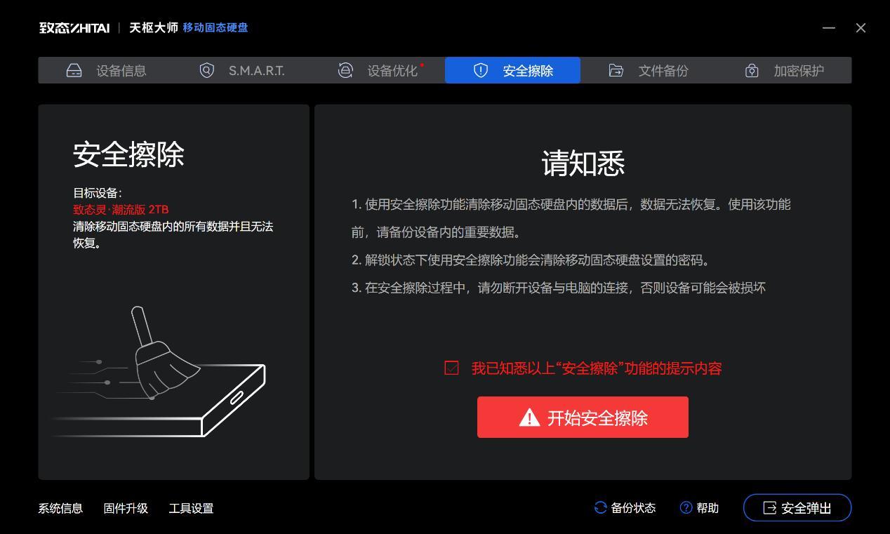 致態天樞大師移動固態硬盤的功能非常豐富,用戶不僅可以看到移動固態硬盤的設備狀態,包括健康度、已用空間、加密狀態、S.M.A.R.T.信息,同時還提供了固件升級、設備優化、安全擦除、文件備份等功能,特別是安全擦除和文件備份功能,對於存儲重要數據的用戶來說非常方便。