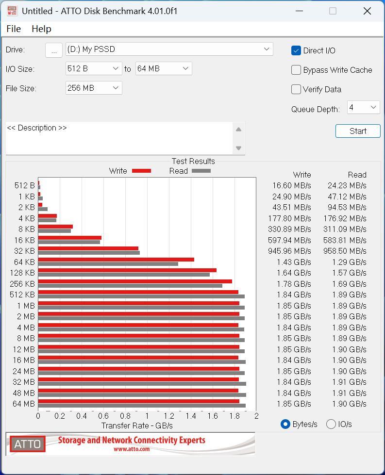 其次是ATTO Disk Benchmark,可以看到其最高持續讀取、寫入性能基本維持在1.9GB/s、1.85GB/s,速度表現同樣非常出色。而且從512KB開始,速度基本保持不變,非常穩定。