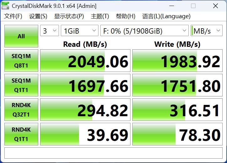 首先是CrystalDiskMark。實測得到順序讀取成績爲2049.06MB/s、順序寫入成績爲1983.92MB/s,完全符合官方宣稱的2000MB/s。無論是傳輸視頻素材,還是工作文件,致態靈·潮流版移動固態硬盤都會有着非常出衆的傳輸效率。