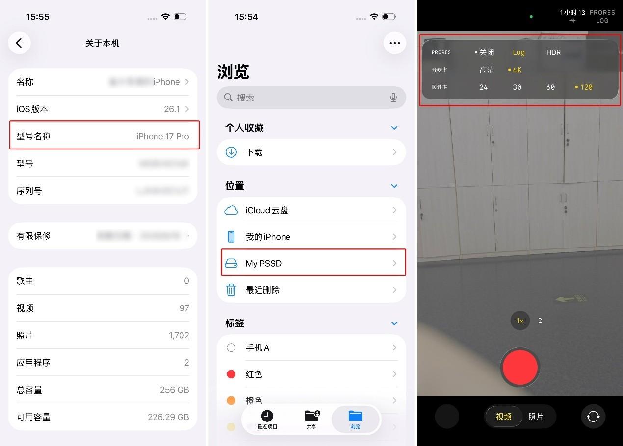從測試的結果來看,四款設備均可以識別並存儲文件,使用完全正常,兼容性非常不錯。同時我們也專門測試了其對於iPhone 17 Pro機型視頻拍攝的支持程度。使用iPhone 17 Pro原生相機的視頻功能,可以正常開啓4K 120幀PRORES Log選項,右上方也正常顯示可拍攝視頻素材的時長,其對於iPhone機型的支持還是很完善的。而且磁吸功能可以直接吸附在iPhone(iPhone15及以上機型)的後側,移動創作更加方便。