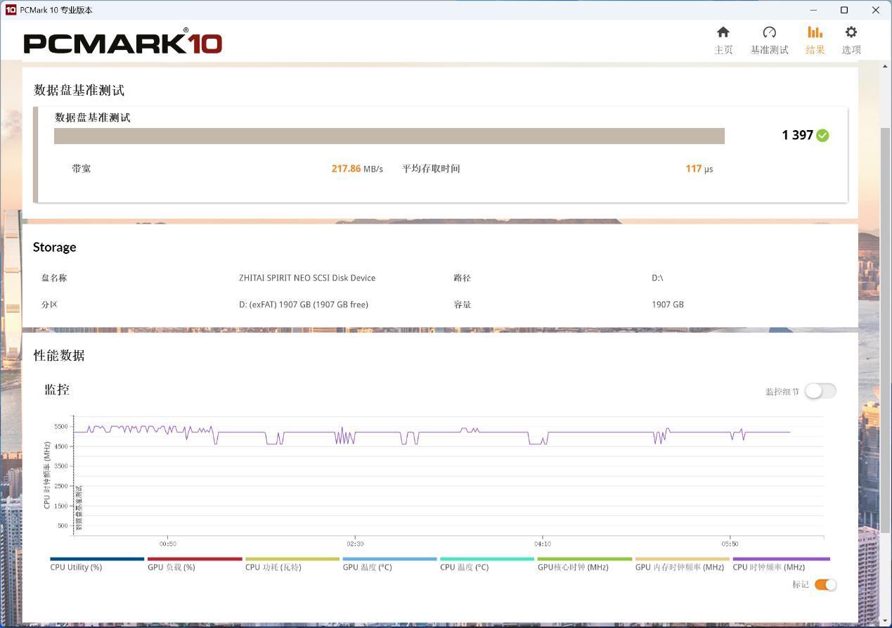 最後是PCMARK10的數據盤基準測試,該測試並非體現極限性能,而是綜合性能。最終得到1397分的成績,在移動固態硬盤中屬於第一梯隊。其中帶寬爲217.86MB/s,平均存取時間爲117μs。
