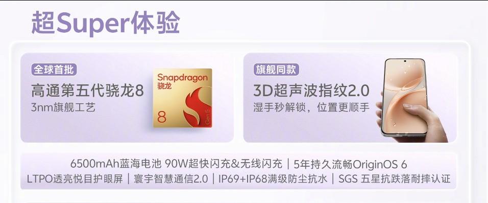 很多人對小直屏手機的擔心,往往集中在性能上,但S50 Pro mini在這一點上給得相當足。它搭載了高通第五代驍龍8旗艦芯片,並配合LPDDR5X Ultra + UFS4.1的存儲組合,再加上VC液冷散熱、X軸線性馬達和立體雙揚聲器,整體配置已經完全對齊行業性能旗艦。