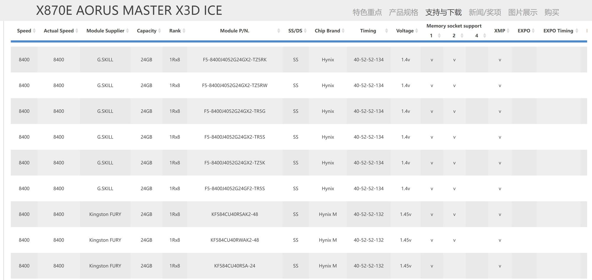最後再科普一下購買內存的技巧,內存兼容性其實相對來說比較玄學,有時候確實會碰到兼容性導致電腦開不開機或者無法充分發揮性能的問題。以技嘉 X870E AORUS MASTER X3D ICE主板爲例,如果針對這款主板去購買內存,大家可以直接去技嘉官網看它的QVL清單,也就是技嘉官方針對這款主板提供的內存支持列表,這些都是技嘉自己實際檢驗過的內存。只要根據這些清單購買通常不會遇到兼容性問題。