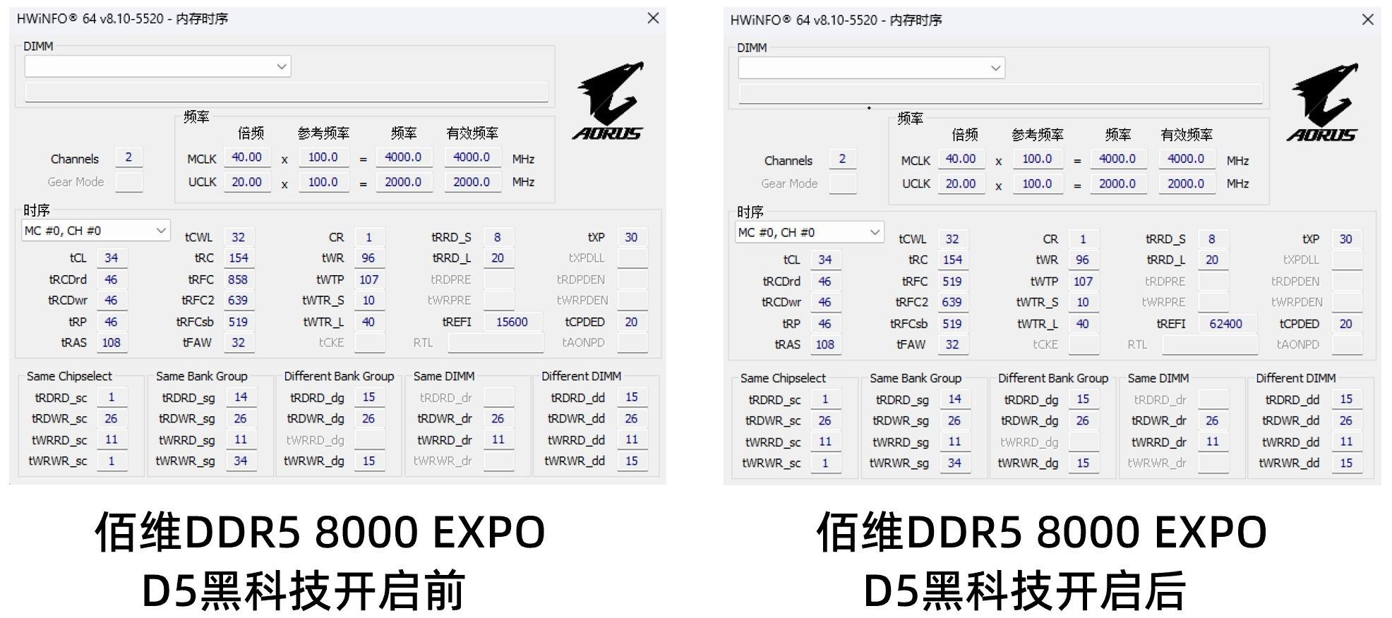 我們接下來給大家首先展示一下開啓XMP/EXPO高頻寬測試的這4款內存時序變化,同時我們打開這4款內存本身的EXPO/XMP預設,實現了XMP 8000MT/s超頻和EXPO 6000MT/s超頻。