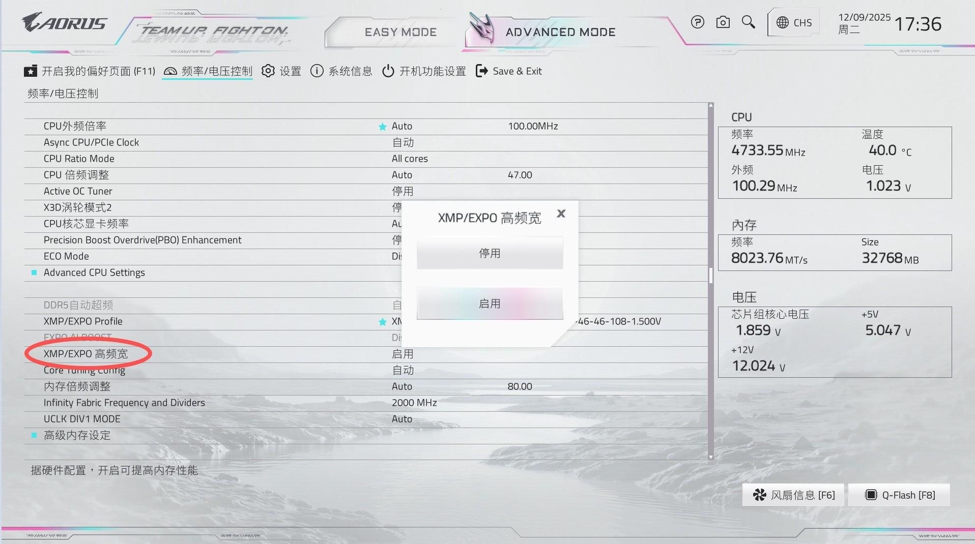 進入到ADVANCED MODE菜單後,往下拉找到XMP/EXPO高頻寬選項,點擊啓用即可開啓技嘉D5黑科技也就一鍵小參優化。