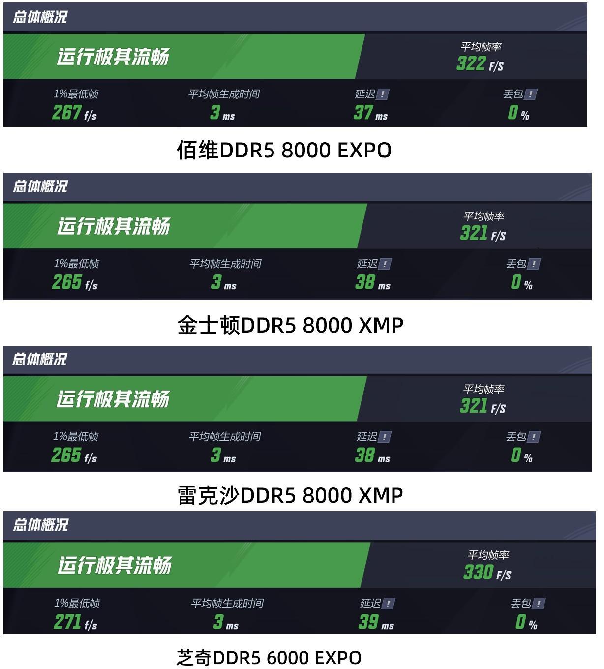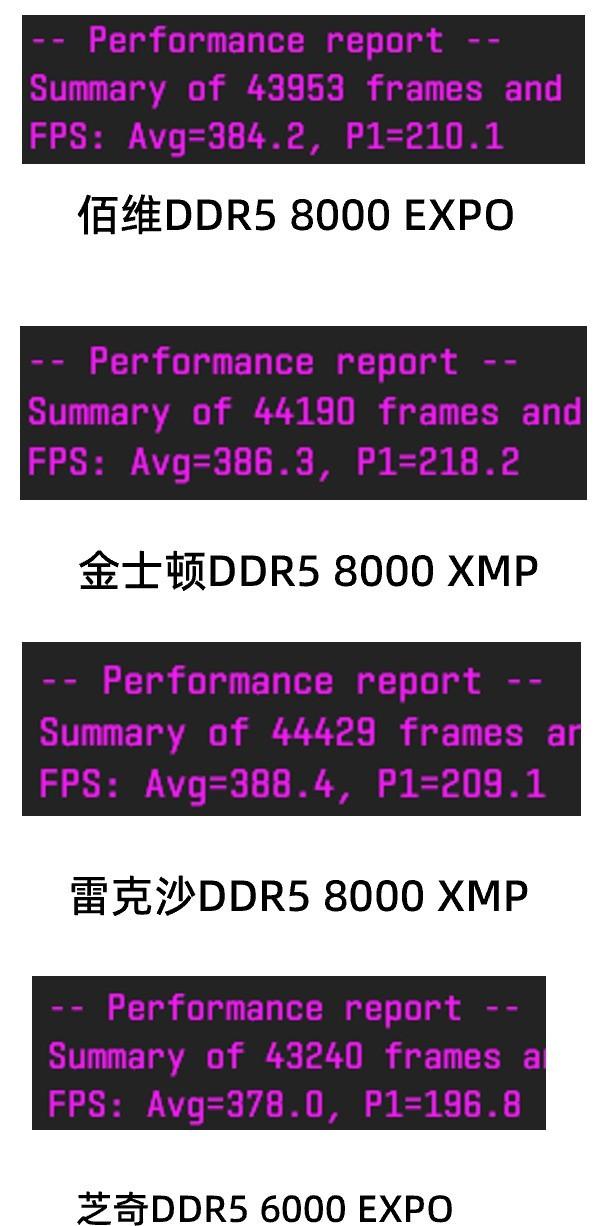 我們首先測試了《漫威爭鋒》,測試成績可以看到經過了技嘉 X870E AORUS MASTER X3D ICE主板的D5優化,三套8000MT/s內存幀數差距不大。幀數表現最好的是芝奇DDR5 6000 EXPO內存,因爲這款內存大時序更低,達到了C28,前面幾款都是C30以上。這也側面說明在《漫威爭鋒》這款遊戲中,DDR5的頻率在達到6000以上,時序對於遊戲幀數的影響更大。
