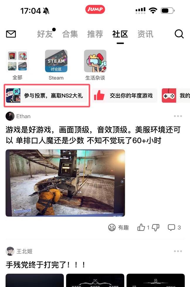 討論大賽參與的方式也很簡單,下載Jump社區,註冊好賬號後,在社區首頁即可看到【參與投票,贏取NS2大禮】的活動。