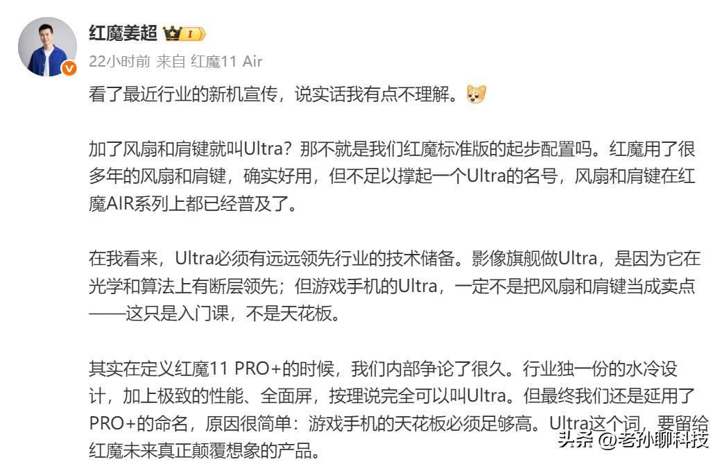 姜超表示,看到友商新機宣傳不太理解,加了風扇和肩鍵就叫Ultra?可這是紅魔標準版的幾部配置,撐不起Ultra名號。影像旗艦機Ultra,是因爲在光學和算法上有斷層領先,Ultra必須有遠超行業的技術儲備,不是把風扇和肩鍵當做唯一賣點,這只是入門課,不是天花板。紅魔11系列頂配也只敢叫Pro+,Ultra要留給顛覆性產品。