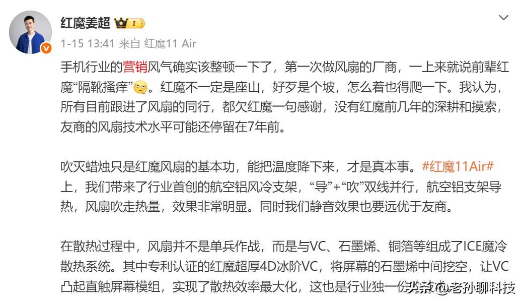 這不是姜超第一次懟友商,上個月還喊話要整頓手機行業營銷風氣,字裏行間雖然沒點名,但都知道直指榮耀WIN系列,要求所有跟進風扇的同行,都欠紅魔一句感謝。如果沒有紅魔幾年深耕和探索,友商風扇技術水平可能還留在7年前。即便友商加入風扇散熱,但紅魔手機是散熱效率最大化,是行業獨一份的技術,友商根本比不了。
