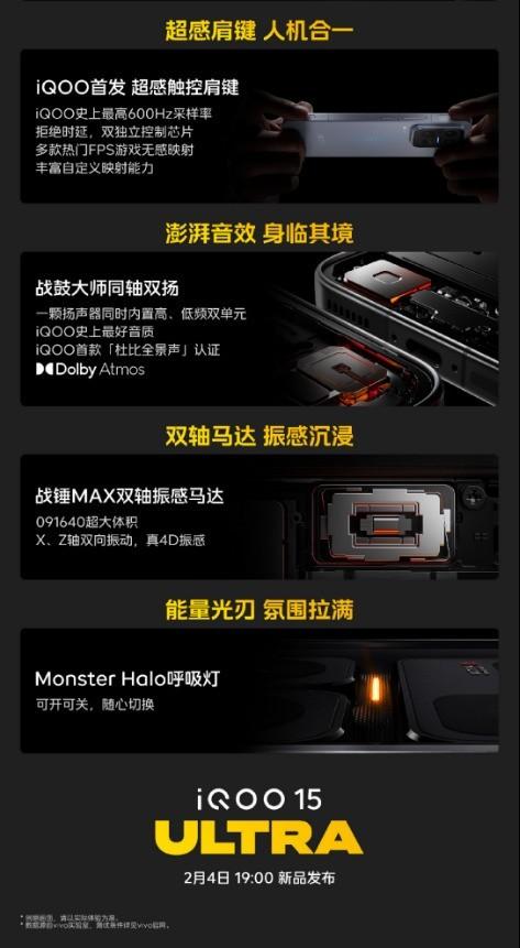 iQOO 15 Ultra 搭載系統級的全新超感遊戲操控,首發 iQOO 史上最高 600Hz 採樣率的超感遊戲肩鍵,具備雙獨立控制芯片,支持多款 FPS 遊戲無感映射和豐富自定義映射能力,瞬時響應不延遲;擁有戰鼓大師同軸對稱雙揚,每顆 1115 揚聲器同時內置高低頻雙單元,更有 iQOO 首款杜比全景聲認證,帶來 iQOO 史上最好音質;具備可同時實現X 軸與 Z 軸雙向振感的戰錘 MAX 雙軸振感馬達,憑藉 091640 超大體積,帶來真 4D 振感;配備 Monster Halo 呼吸燈,開關、切換皆隨心的能量光刃,在遊戲中可聯動外設光效營造濃濃氛圍感。操控感滿級的超感遊戲操控,將助極致玩家獲得更沉浸的電競體驗。