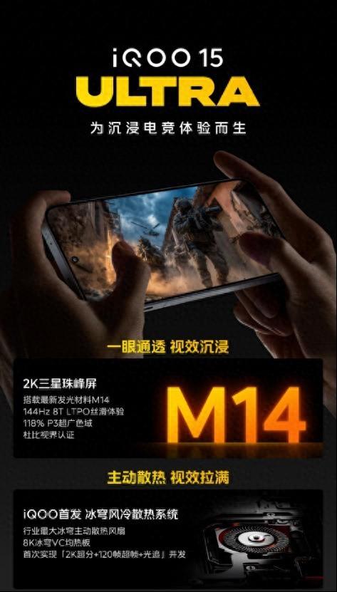 iQOO 15 Ultra 搭載 2K 三星珠峯屏,採用 2K LEAD OLED 技術和 M14 發光材料,具備至高 8000nits 亮度、144Hz 8T LTPO 絲滑體驗、118% P3 超廣色域和杜比視界認證等,帶來“一眼通透”的觀賞體驗;首發 iQOO 冰穹風冷散熱系統,具備行業最大的冰穹主動散熱風扇和行業最大單層 8K 冰穹 VC 均熱板,強勁的散熱表現助力手機性能極致發揮,首次實現“2K 原畫超分 + 120FPS 超幀 +全場景光追”的三視效頂格併發。