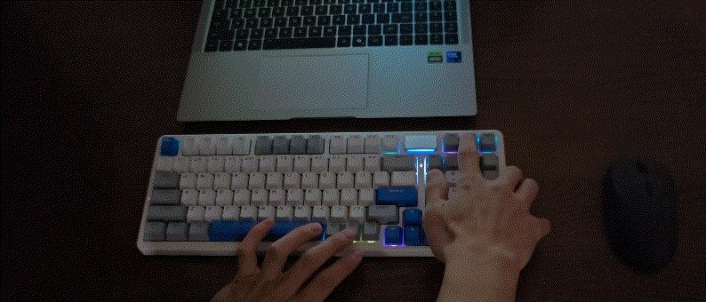 鍵盤內部採用柔韌Gasket結構,內置7層消音填充:硅膠墊、Poron夾心棉、IXPE軸下墊、PET聲優墊、Poron消音底棉、PET底墊及定製底部填充。這種堆料設計有效減少按鍵共振,聲音更純淨,手感更一致。實測敲擊時,聲音被壓縮爲悶悶的“嘚嘚”聲,類似雨滴落在木地板,無空腔音或鋼絲音。