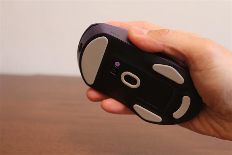 配色方面,VT9 MAX提供“電馭紫”“皎月白”“星空黑”三款選擇,三款都採用親膚防滑塗層,觸感溫潤且防汗防滑。我這款就是電馭紫配色,底部延續經典的三段式貼腳設計,後半程接觸面積更小,滑動阻力降低30%,搭配磁吸式附件倉(支持充電底座與無線模塊擴展),進一步強化了模塊化設計理念。