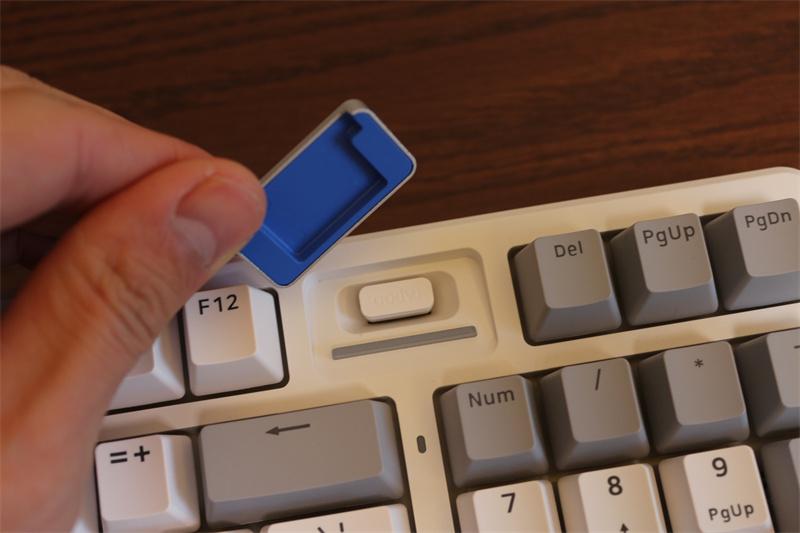 鍵盤右上角創新設計“時空幻境倉”,鋁合金磁吸上蓋內嵌接收器收納倉,下方集成RGB電量指示燈。通過Fn+空格鍵可實時查看電量狀態(綠色→黃色→橙色→紅色→紅燈閃爍),也可通過驅動自定義燈光顏色或關閉。