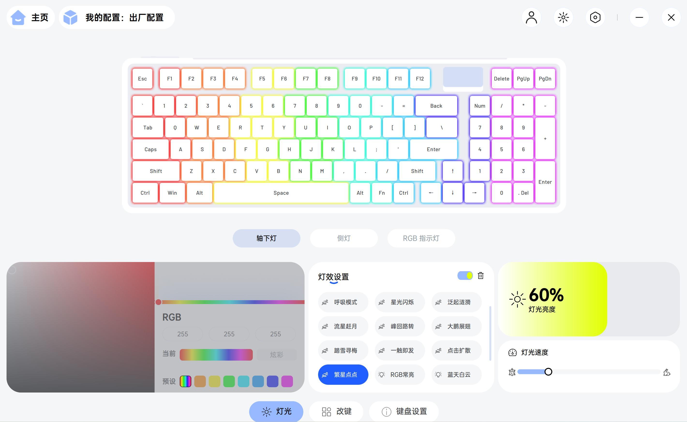 雷柏V700DIY-98長續航版同樣支持炫酷的燈光效果調節,包括亮度光速度等等都可以調節,還可以進行改鍵操作,設置宏等等。