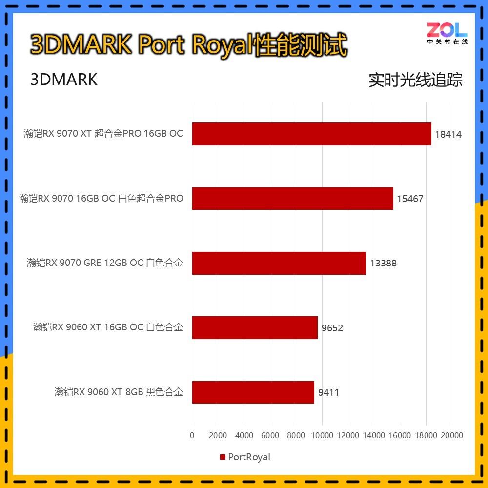Port Royal是實時光線追蹤測試,目前越來越多的遊戲都會加入光線追蹤來提升視覺效果,但它對性能的開銷非常大,對於A卡來說,基本只有RX 9000系才能夠暢玩光追遊戲。