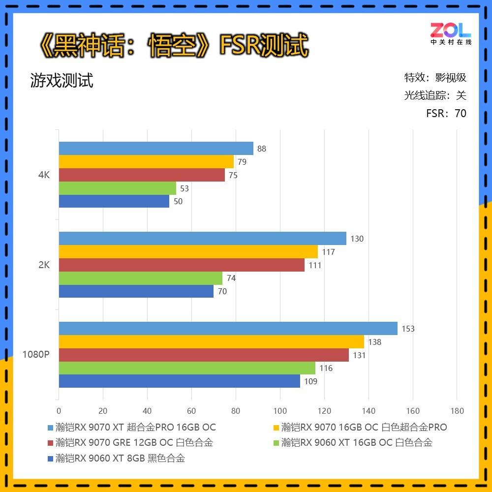 在《黑神話:悟空》中,測試採用最高的影視級畫質,光線追蹤關,FSR設定爲70。在1080p分辨率中,存在一定處理器瓶頸,70級顯卡雖然處於較高的電競級幀率,但沒有達到性能的最大釋放。